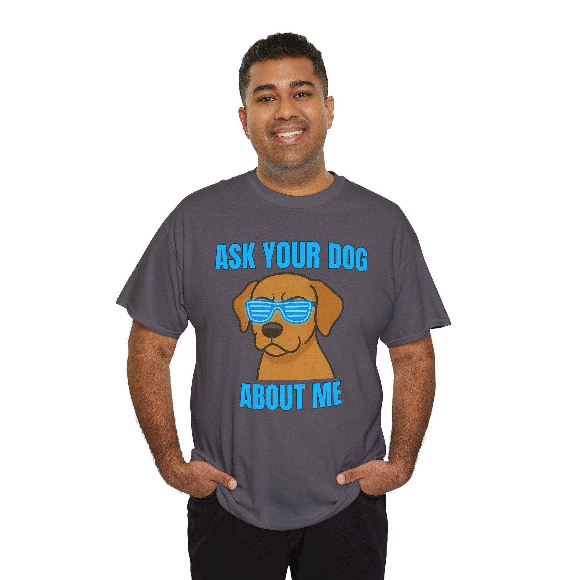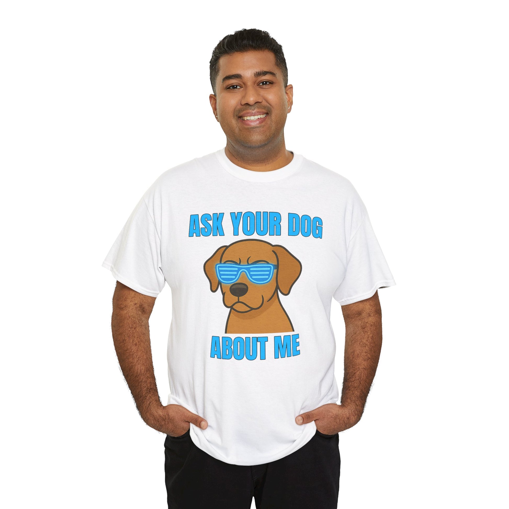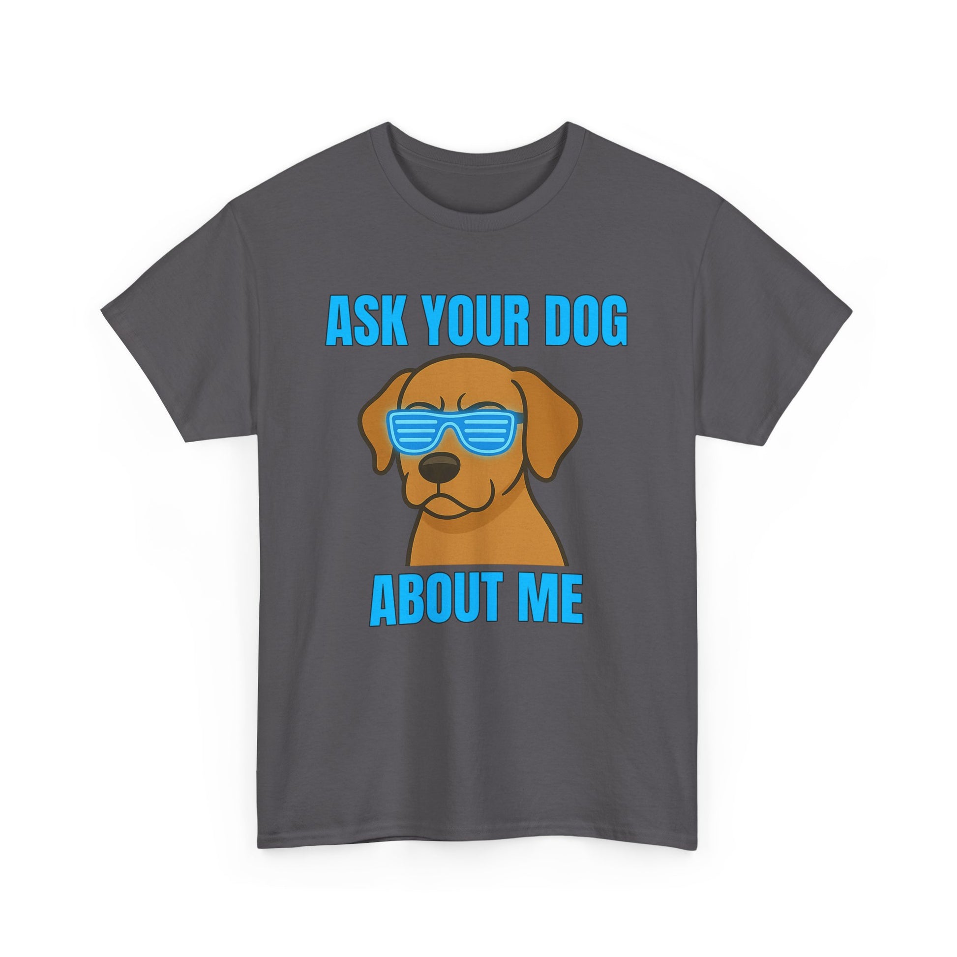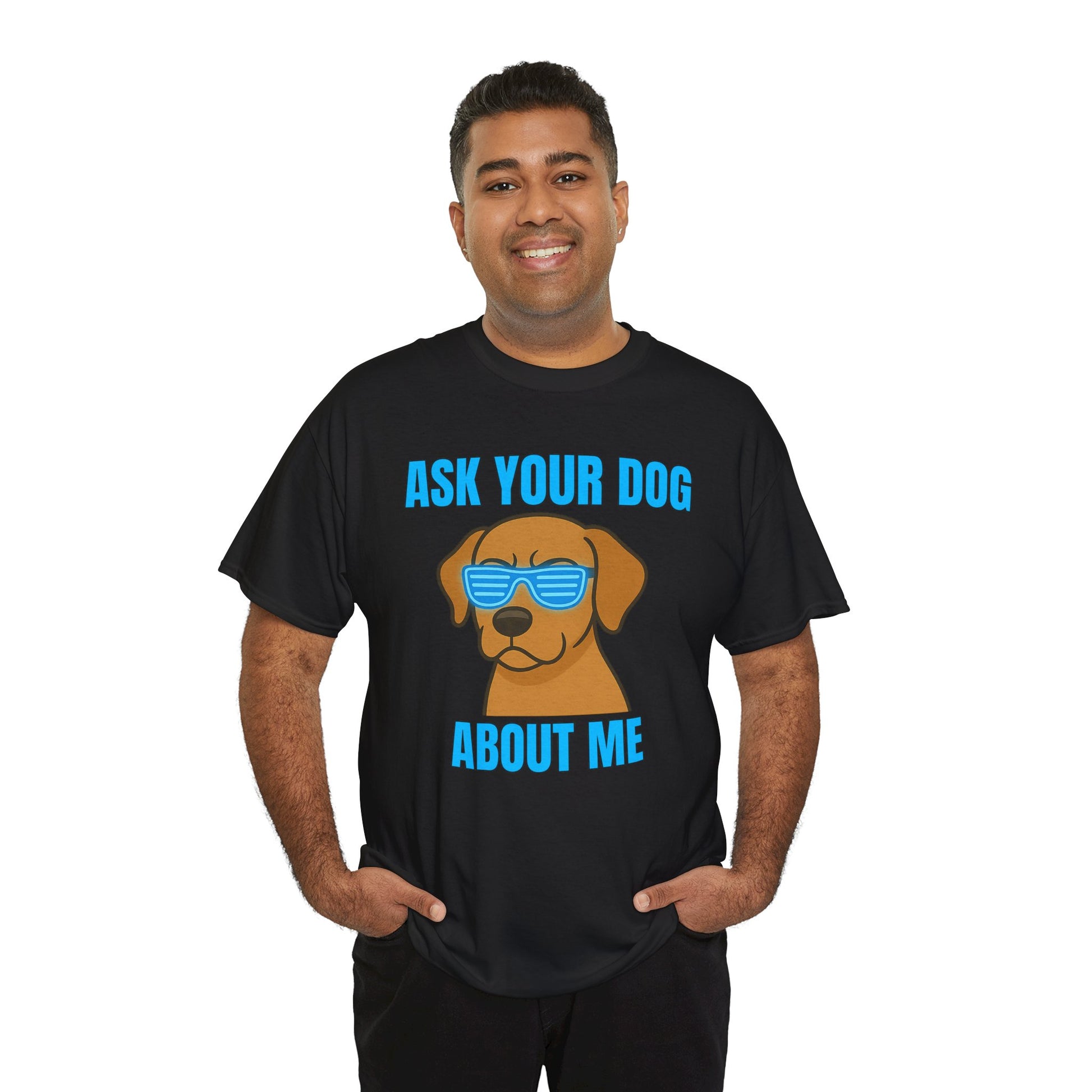 funny dog shirt, ask your dog about me t-shirt, dog lover humor tee, novelty dog graphic shirt, cool dog sunglasses shirt, pet lover funny t-shirt, dog park outfit, sarcastic dog shirt, gift for dog owners, humorous animal tee, casual funny shirt for men women, quirky dog lover apparel, joke t-shirt with dog design