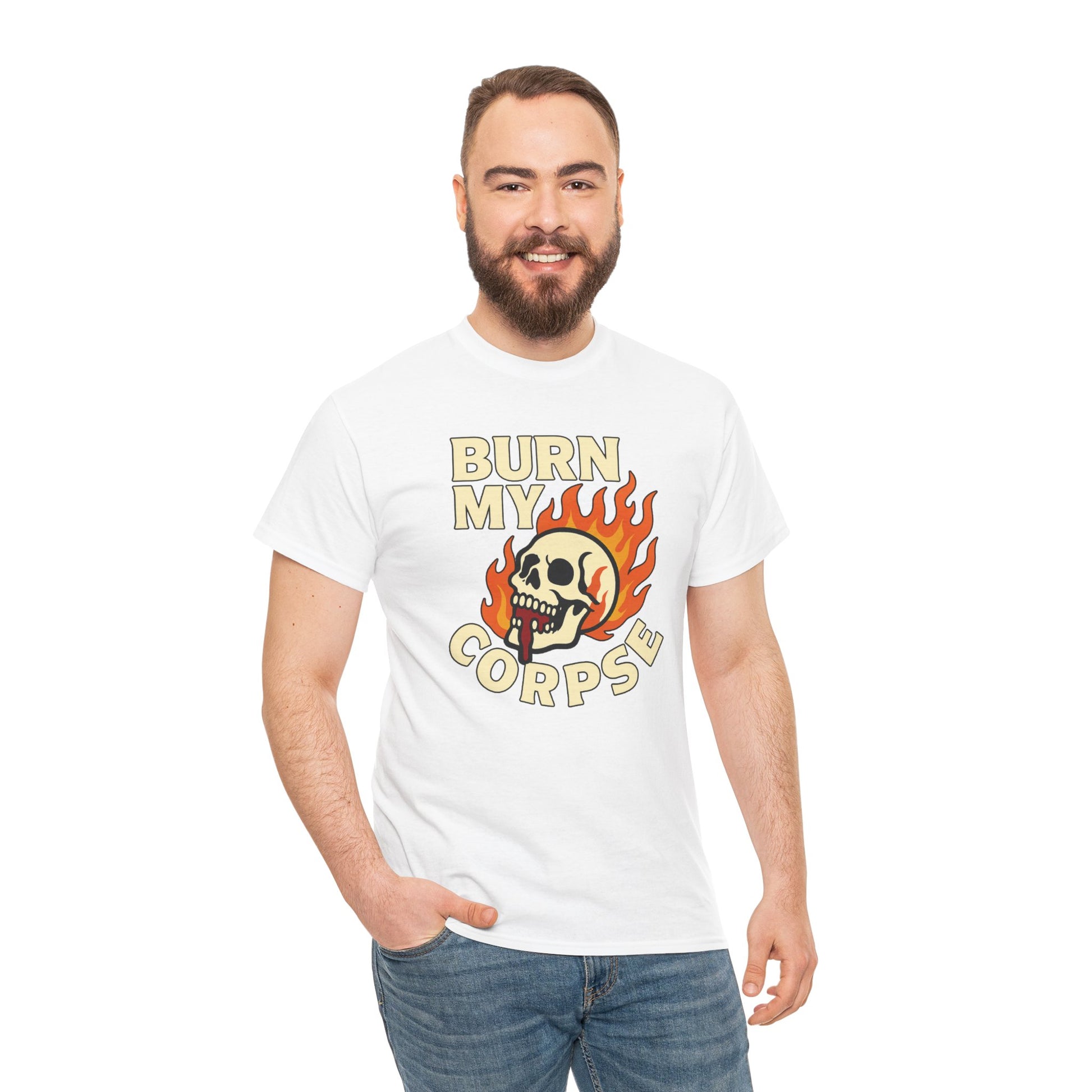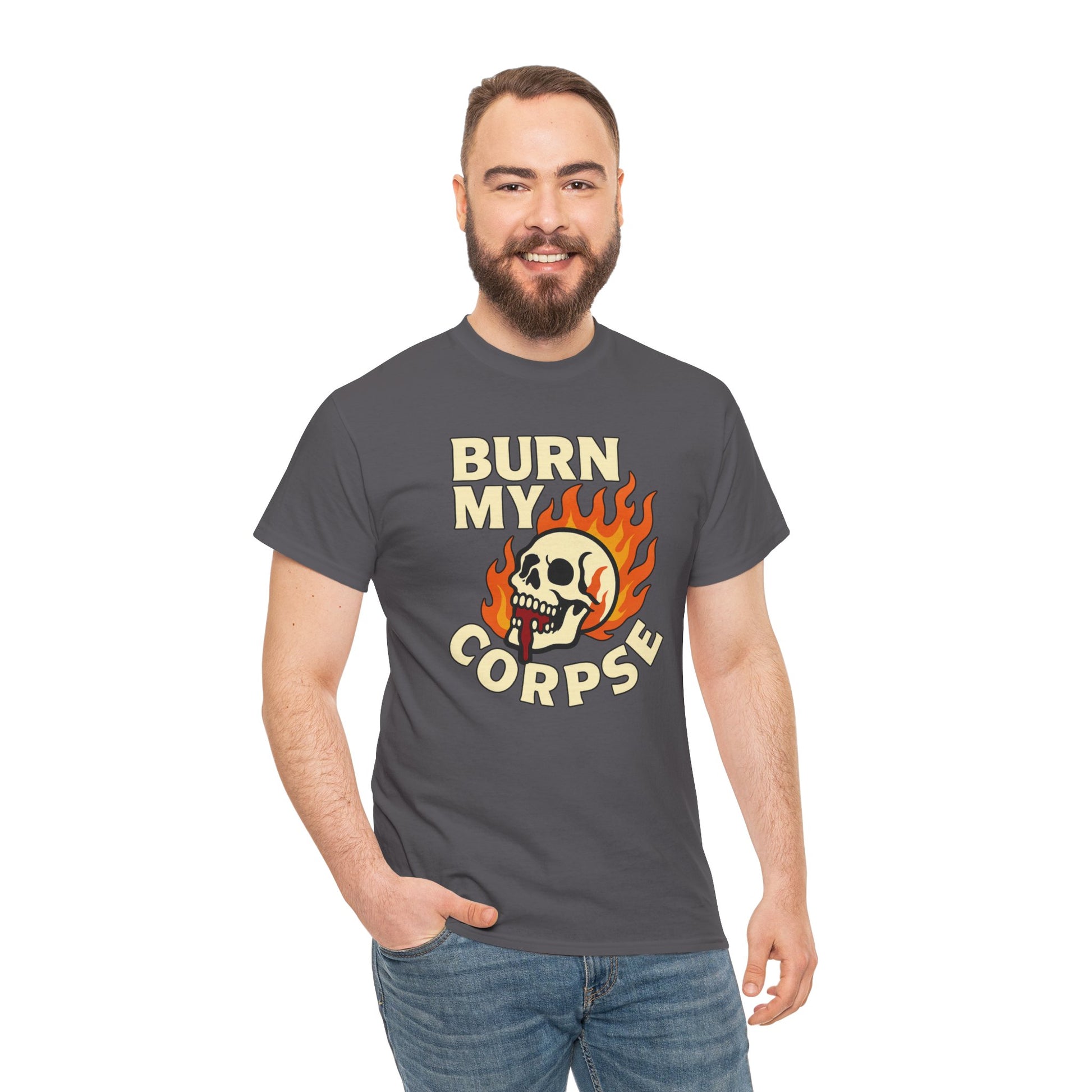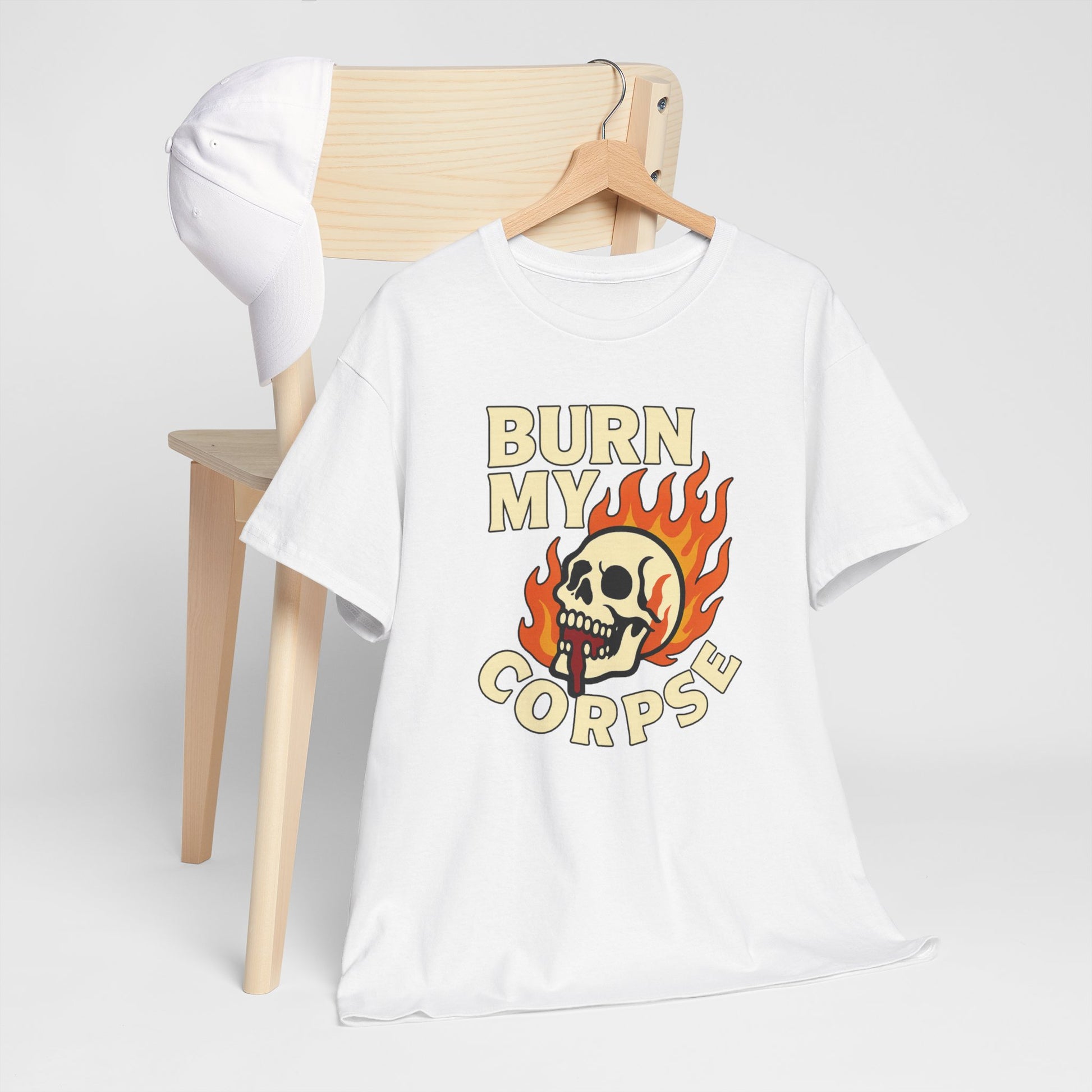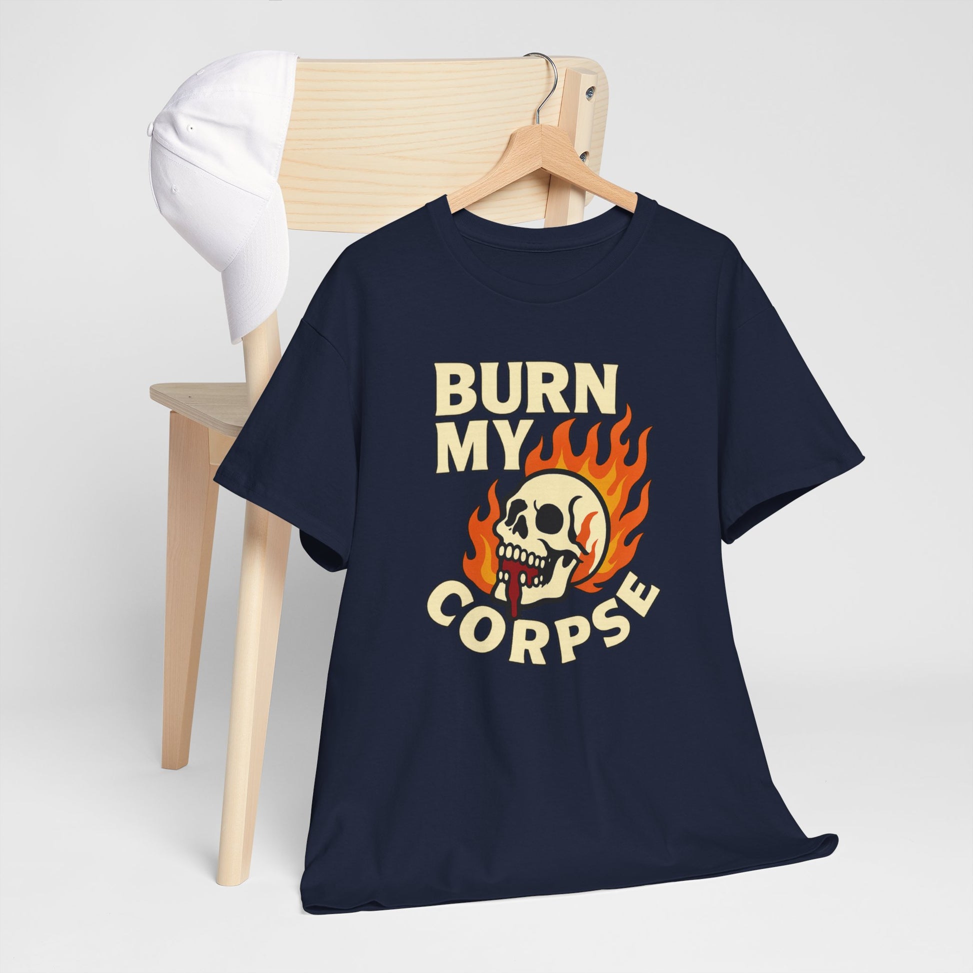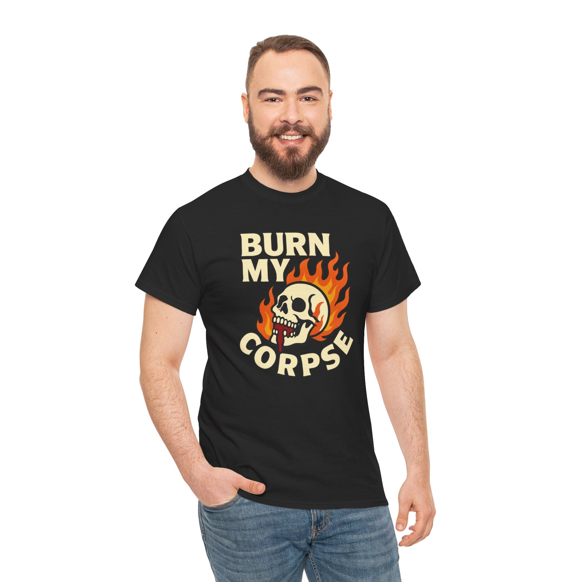 Burn My Corpse shirt, flaming skull t-shirt, dark humor graphic tee, goth streetwear, metal skull shirt, rebellious fashion, alternative clothing, skull and fire t-shirt, edgy funny shirt, punk rock graphic tee, sarcastic humor shirt, bold skull tee, heavy metal inspired t-shirt, creepy cool shirt, black graphic tee.