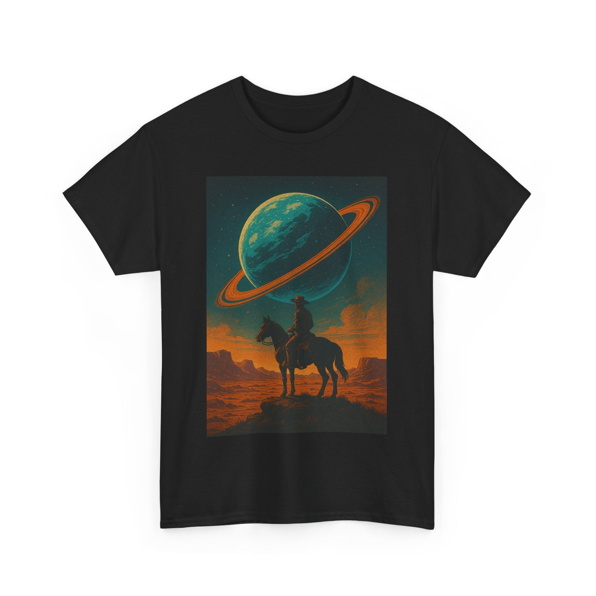 Keywords: cosmic cowboy t-shirt, sci-fi western shirt, space cowboy graphic tee, cowboy planet shirt, surreal desert t-shirt, black alien world shirt, lone rider space tee, cowboy under saturn shirt, fantasy western apparel, psychedelic outer space tee
