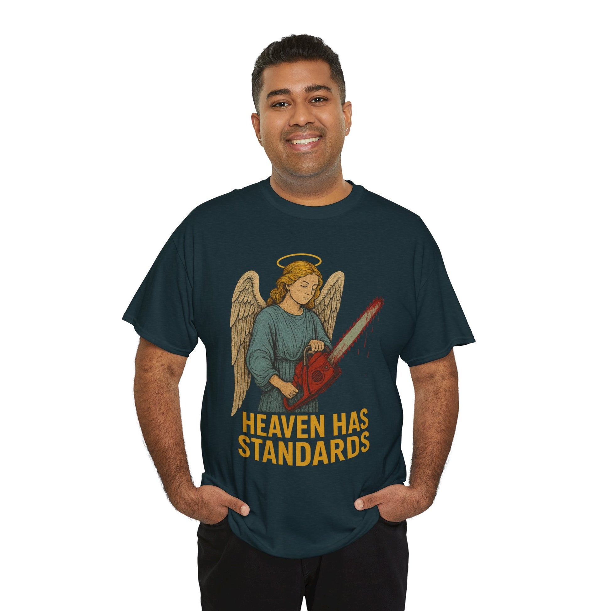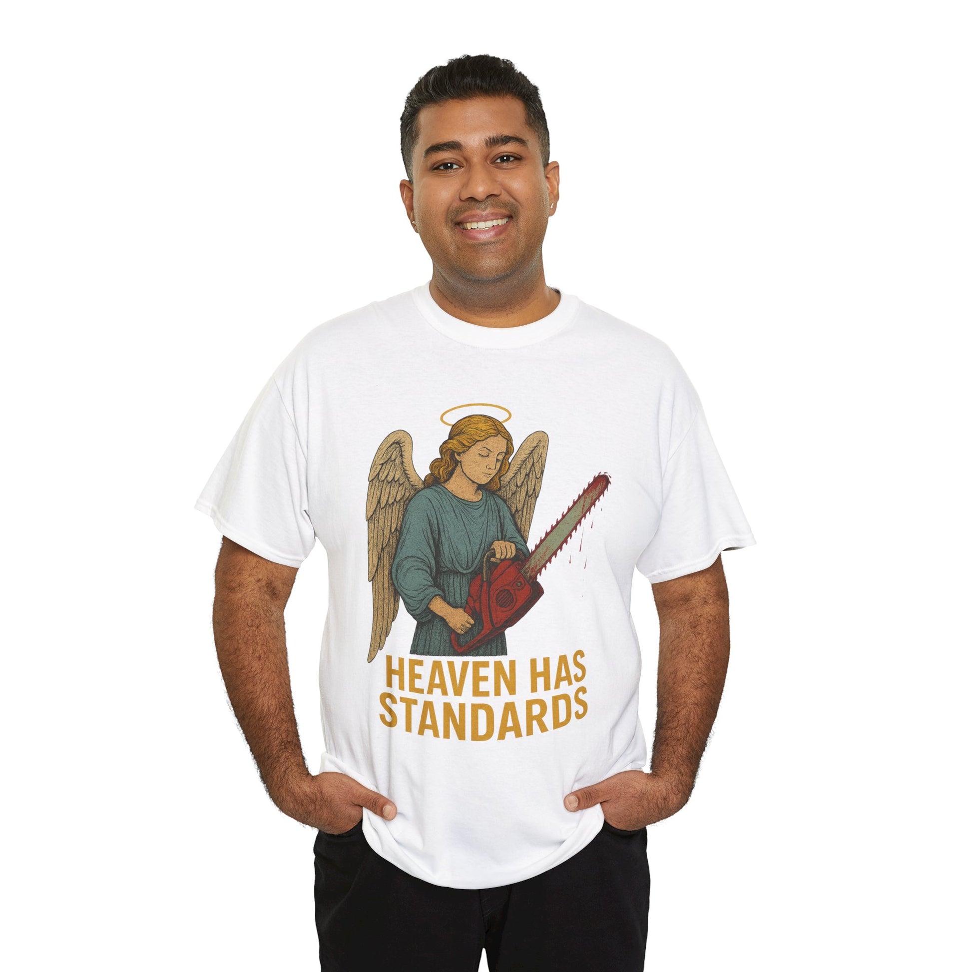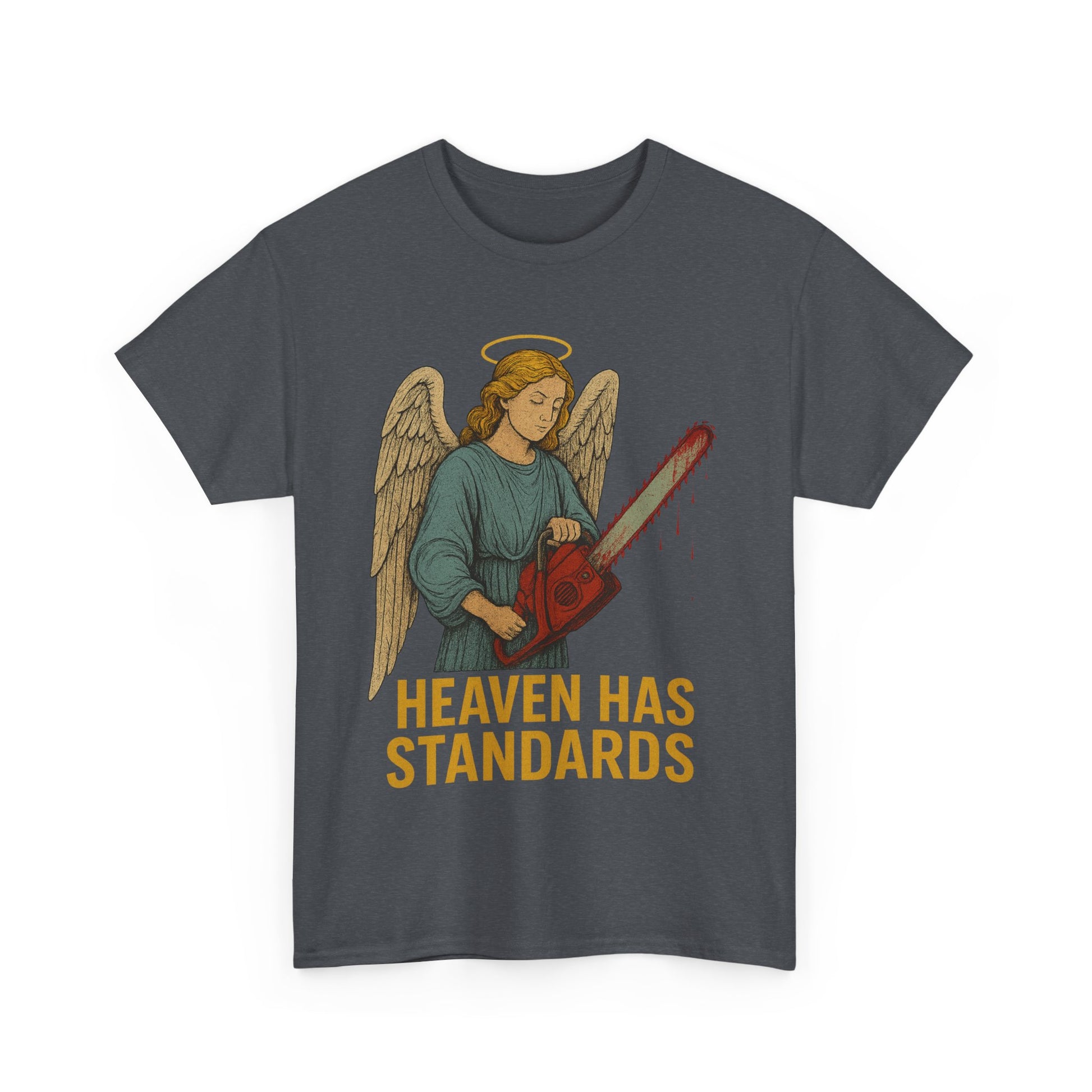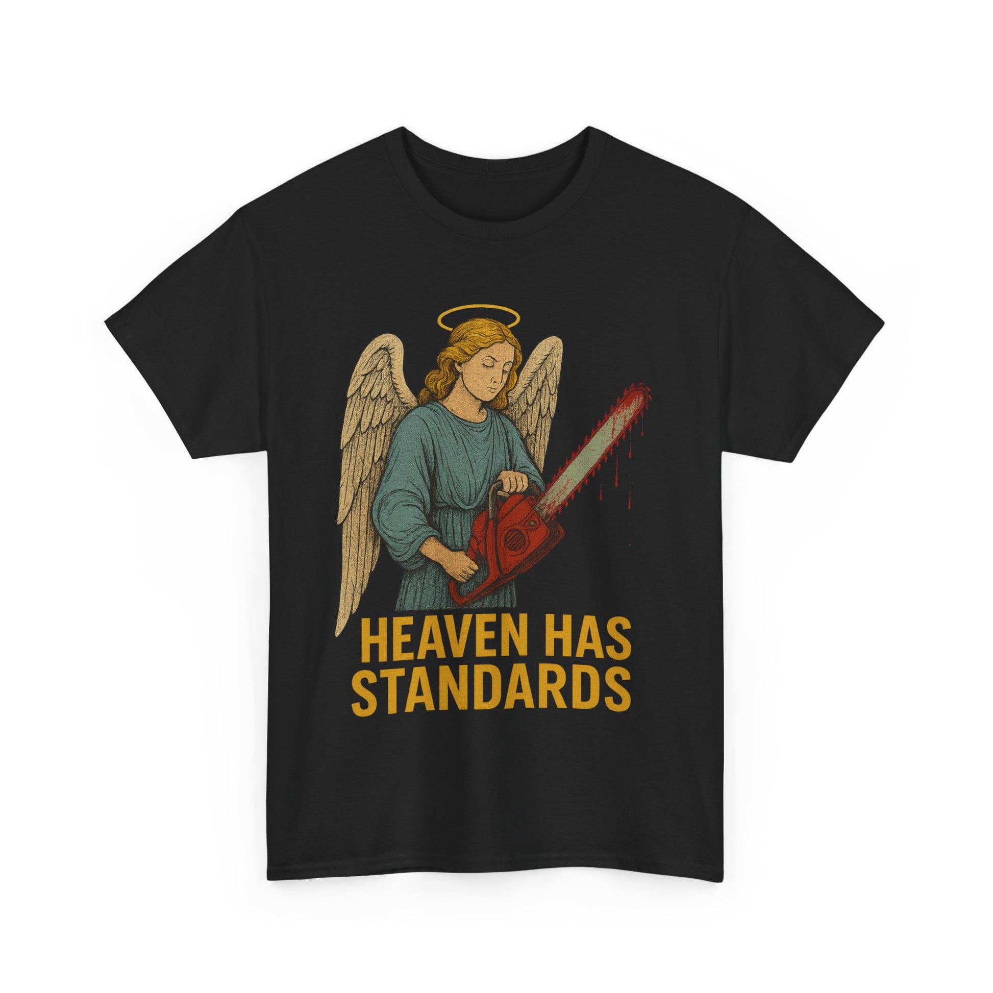 funny angel t-shirt, heaven has standards shirt, dark humor religious tee, angel with chainsaw shirt, edgy Christian humor shirt, brutal angel graphic tee, sarcastic angel shirt, irreverent religious humor tee, badass angel design, heaven judgment shirt