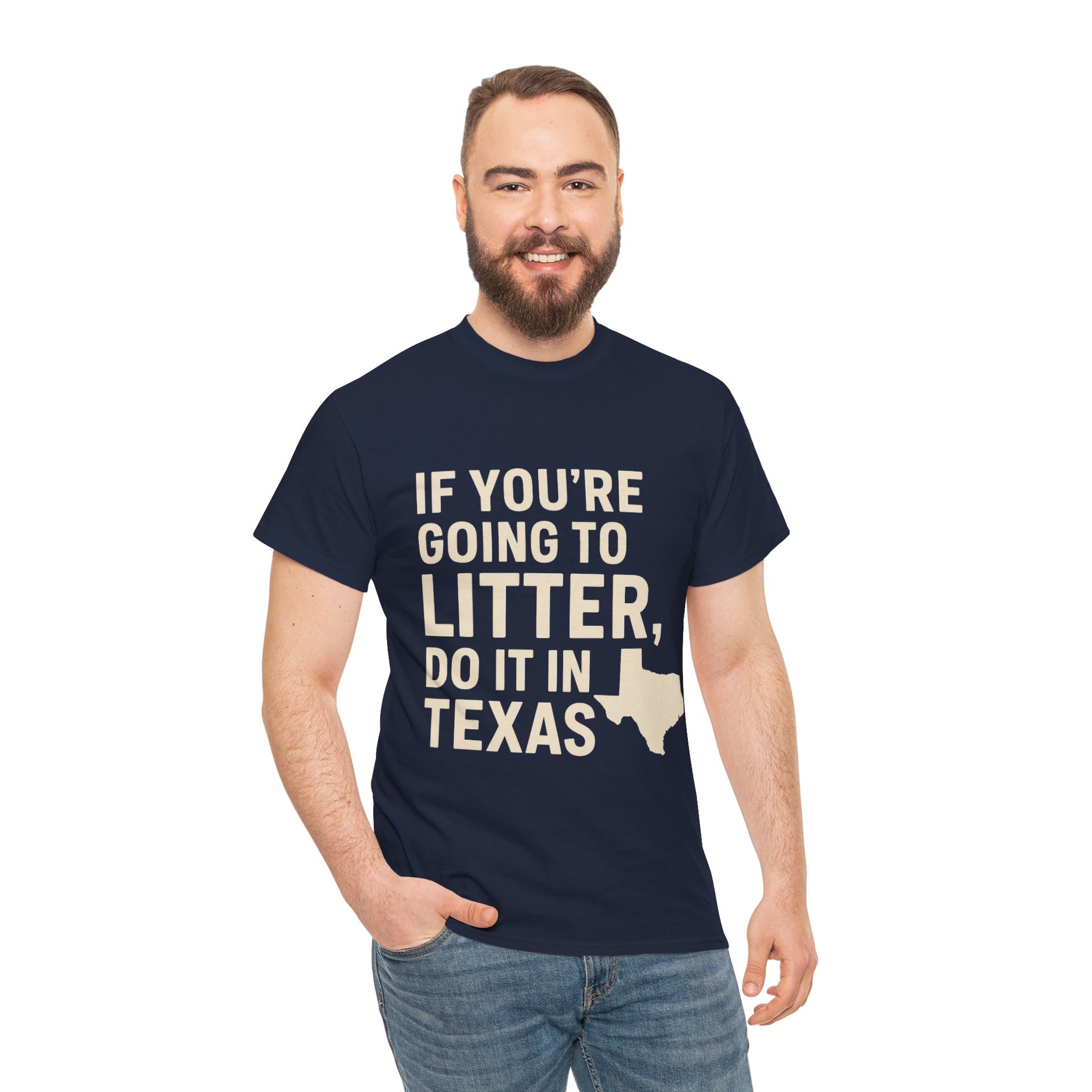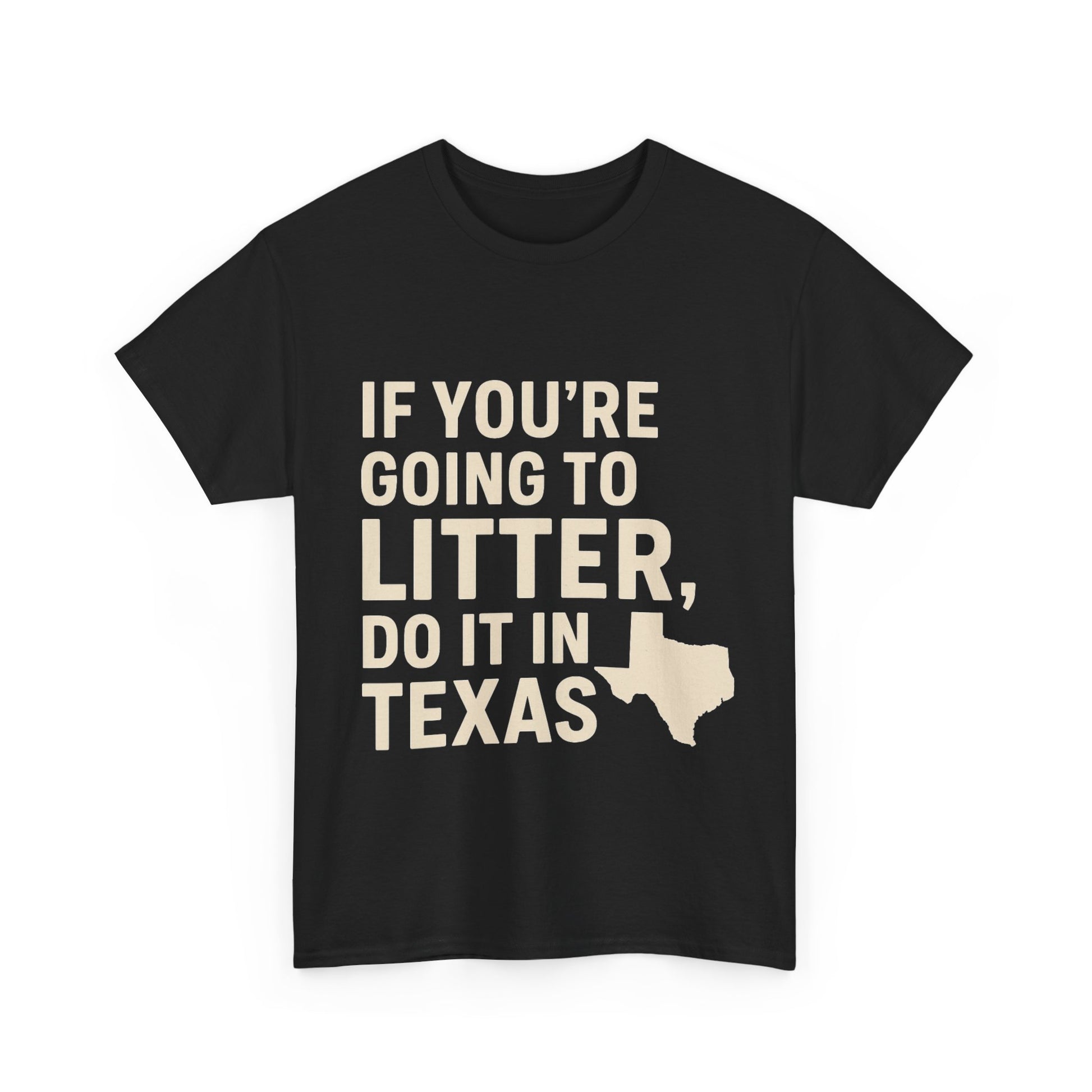 Show off your dark, sarcastic sense of humor with this bold Texas-themed t-shirt. Featuring the phrase “If You’re Going to Litter, Do It in Texas” with a Texas state silhouette, this shirt is perfect for anyone who loves edgy jokes, anti-PC humor, or Lone Star State banter.
