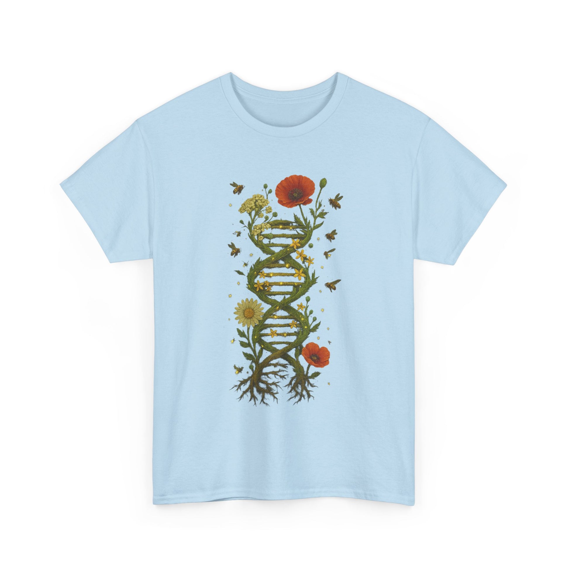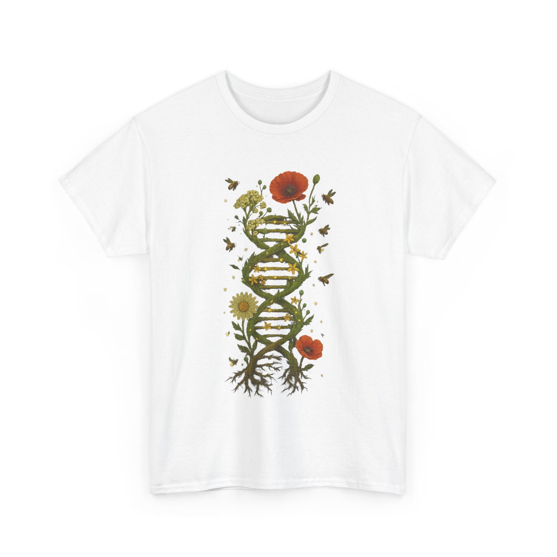 Celebrate the beautiful connection between life and science with this crisp white tee featuring a DNA double helix made entirely of plants, roots, and blooming flowers. Butterflies and bees swirl around the structure, blending biology with natural beauty in this elegant, eco-inspired design. Perfect for plant lovers, science geeks, and anyone rooted in nature.
