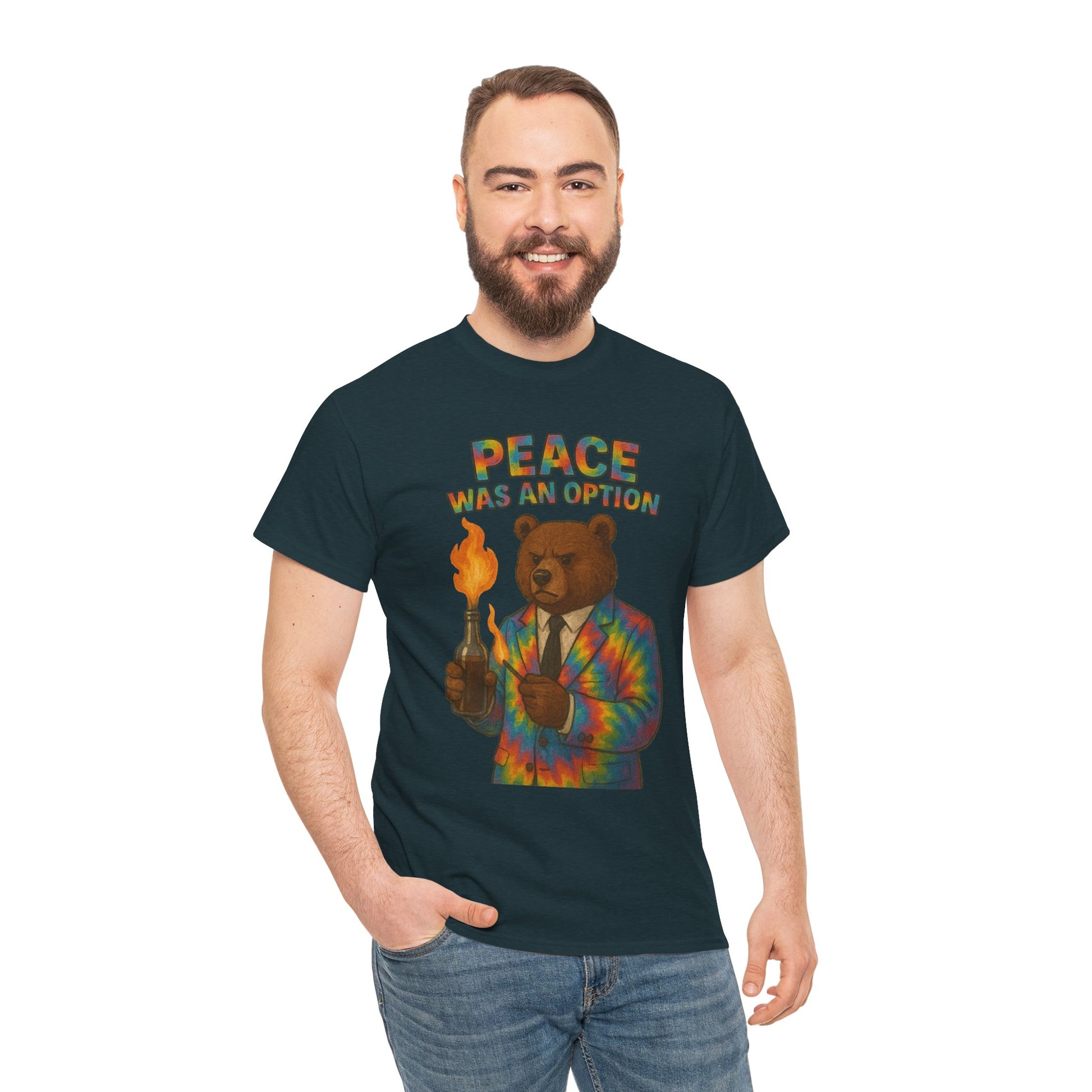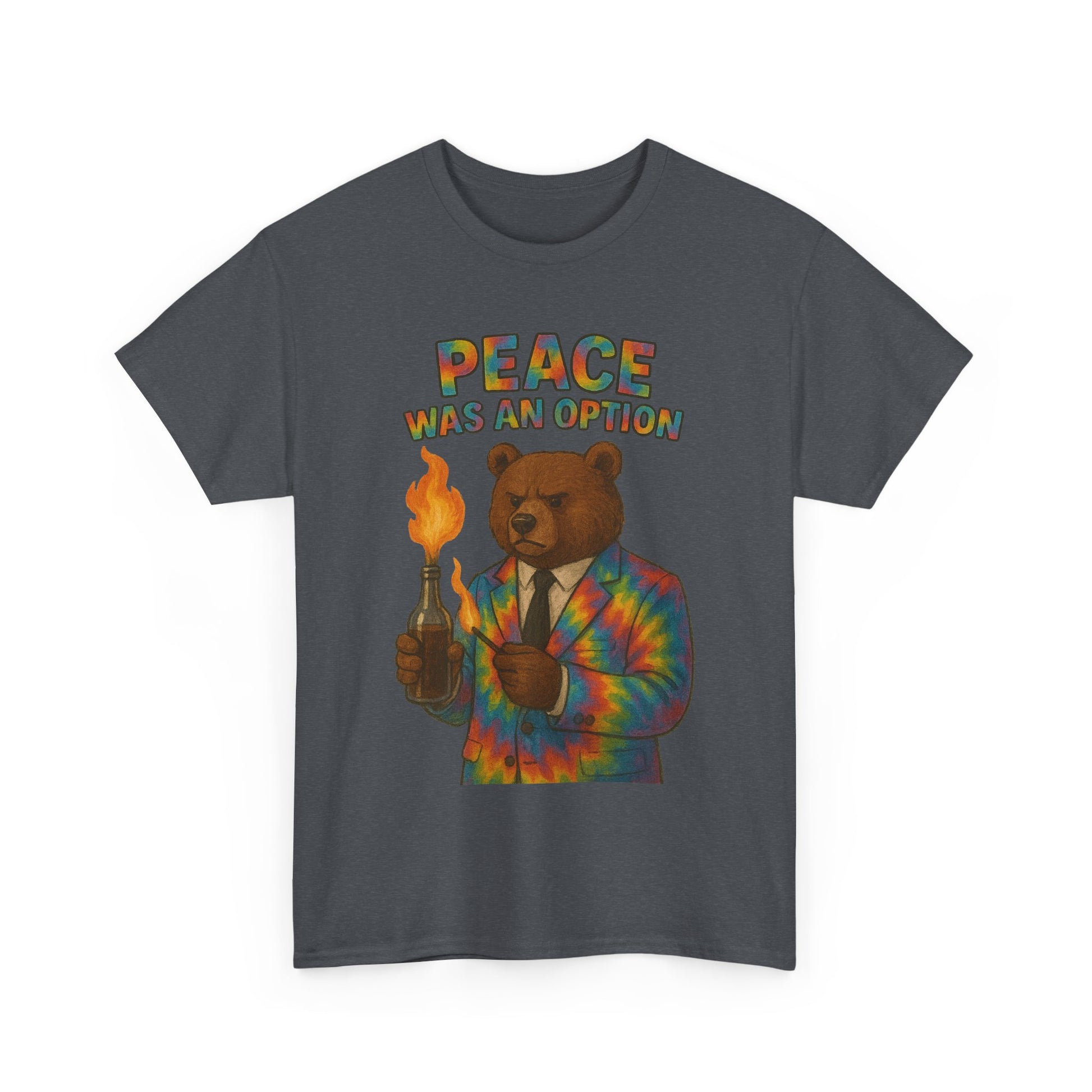 peace was an option shirt, angry bear Molotov t-shirt, funny protest shirt, tie-dye suit bear tee, rebellious animal shirt, absurd political humor tee, anarchist animal graphic, trippy bear art shirt, psychedelic chaos shirt, molotov cocktail bear tee
