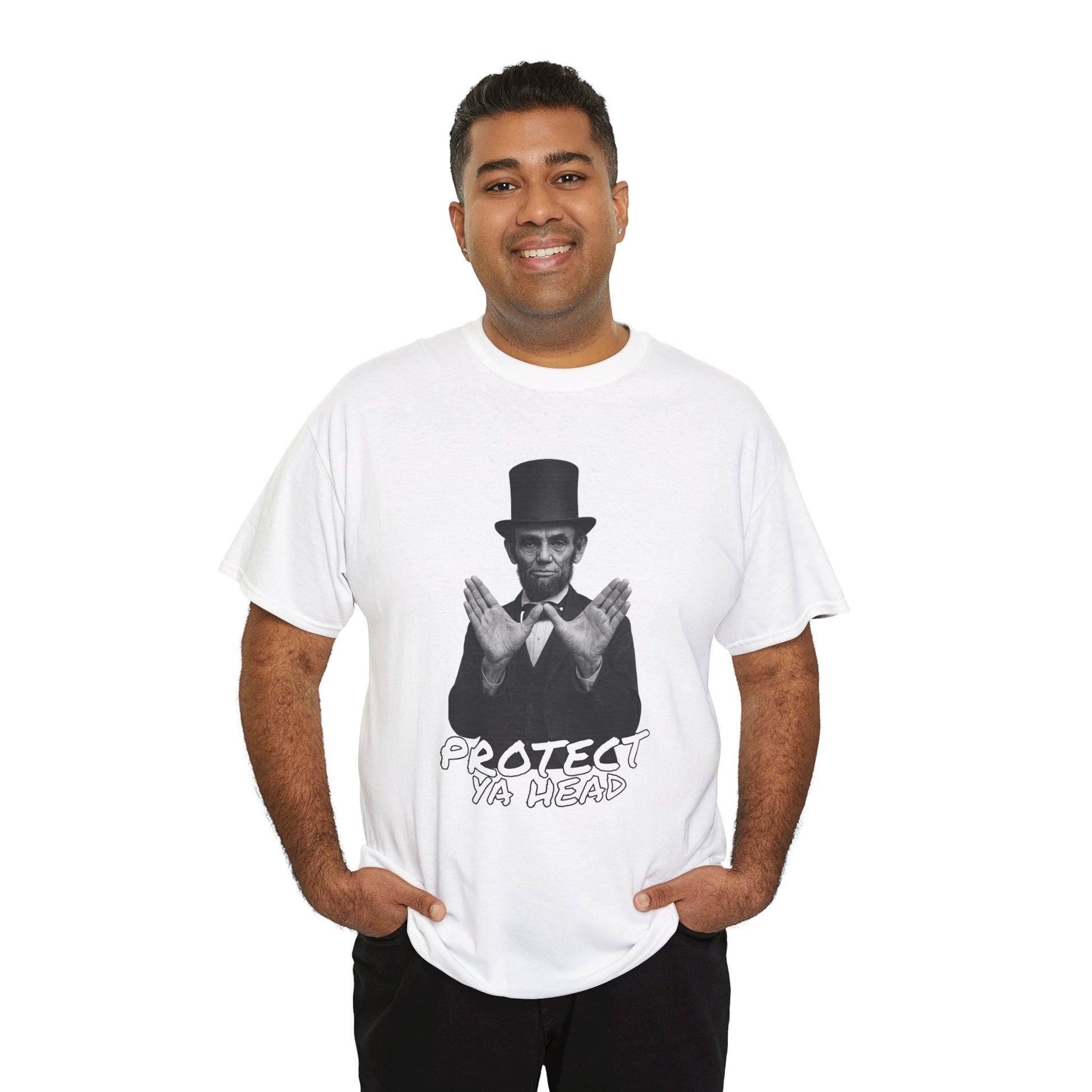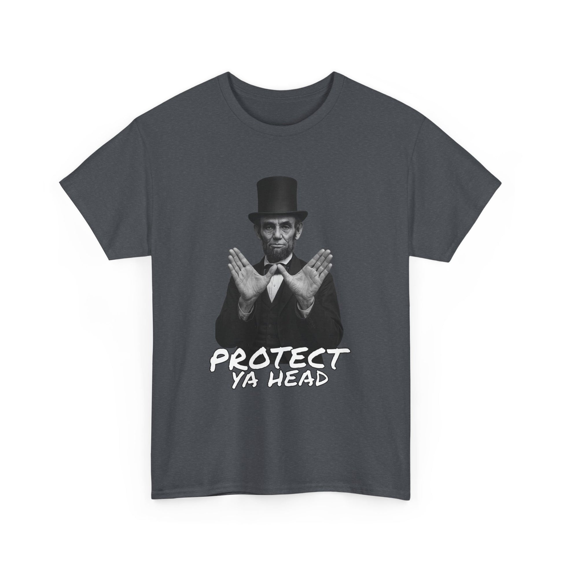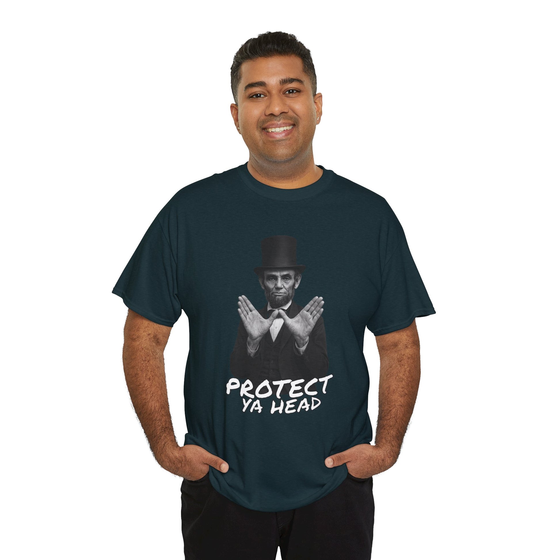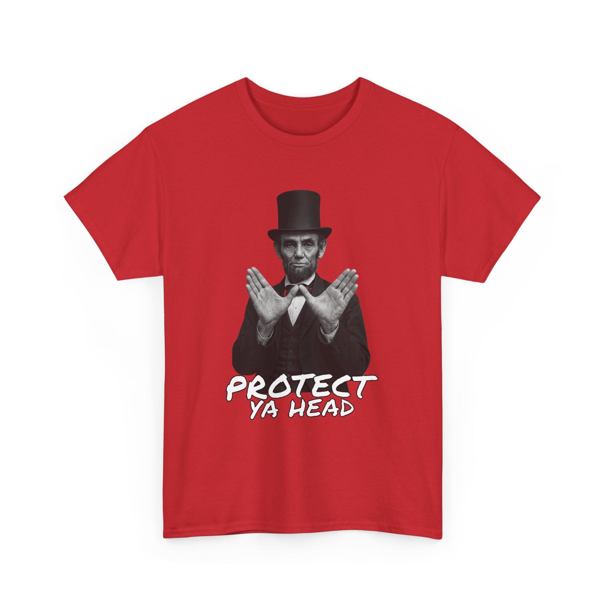 Keywords: Abraham Lincoln shirt, funny history shirt, Protect Ya Head shirt, novelty Abe Lincoln t-shirt, historical humor shirt, unique presidential tee, Lincoln fan gift, political humor shirt, modern history mashup
