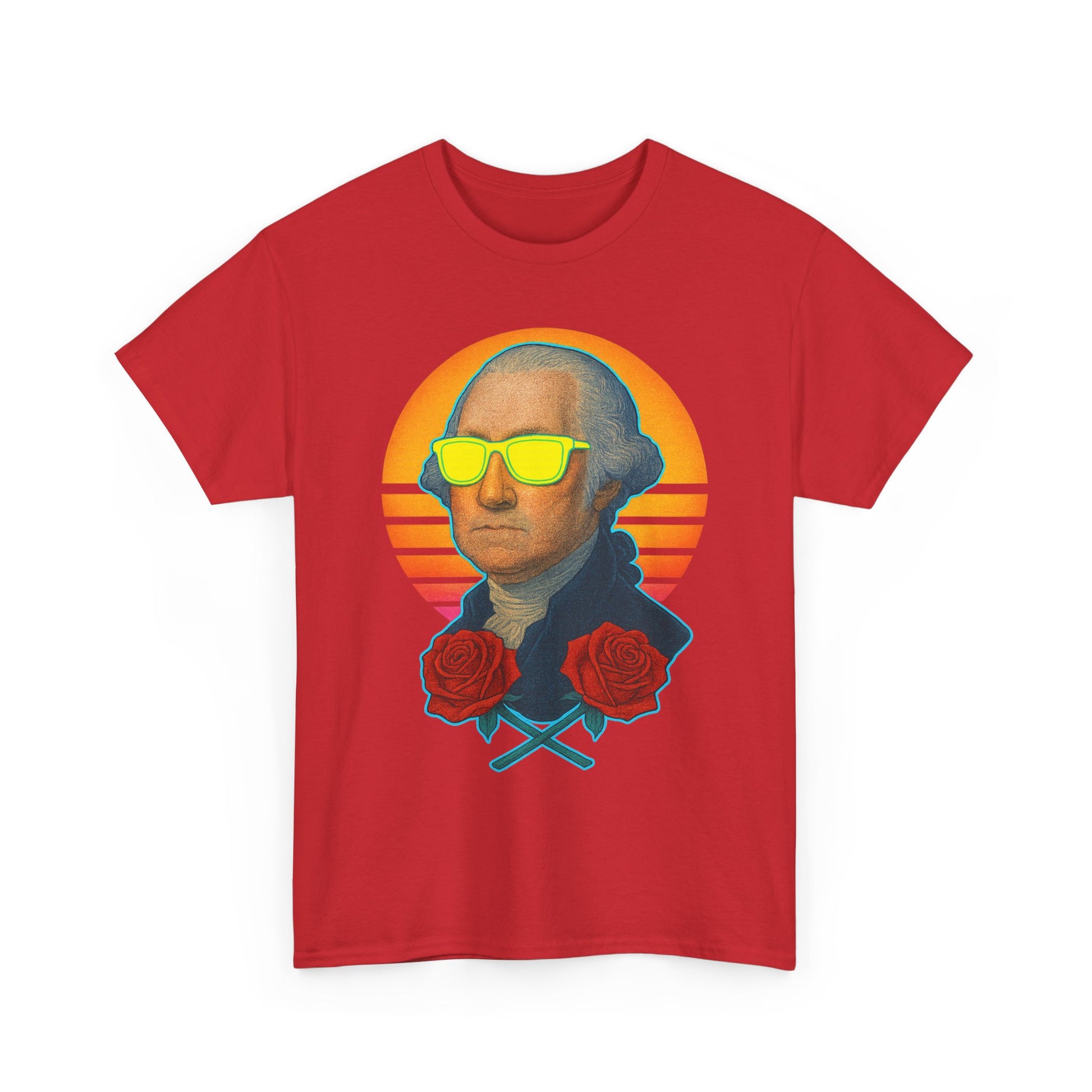 This bold graphic tee blends American history with vintage sunset vibes and futuristic neon flair. Featuring George Washington with glowing yellow shades, vibrant red roses, and a retro horizon backdrop, it's the perfect shirt for patriots with style. Whether you're into history, synthwave aesthetics, or just love weirdly awesome shirts, this one makes a statement: dead presidents never looked this fresh.