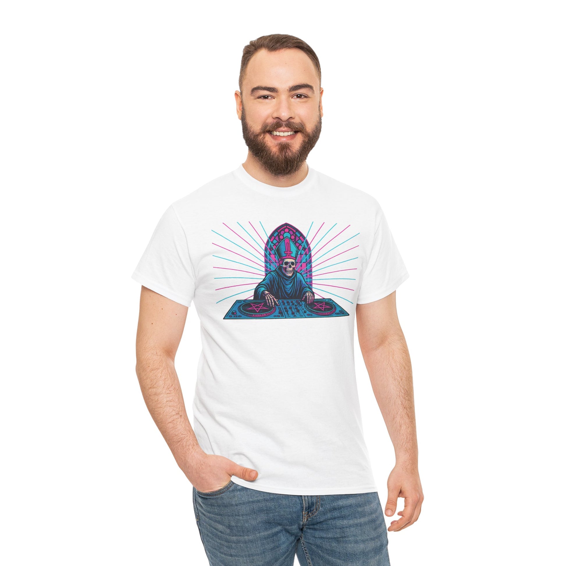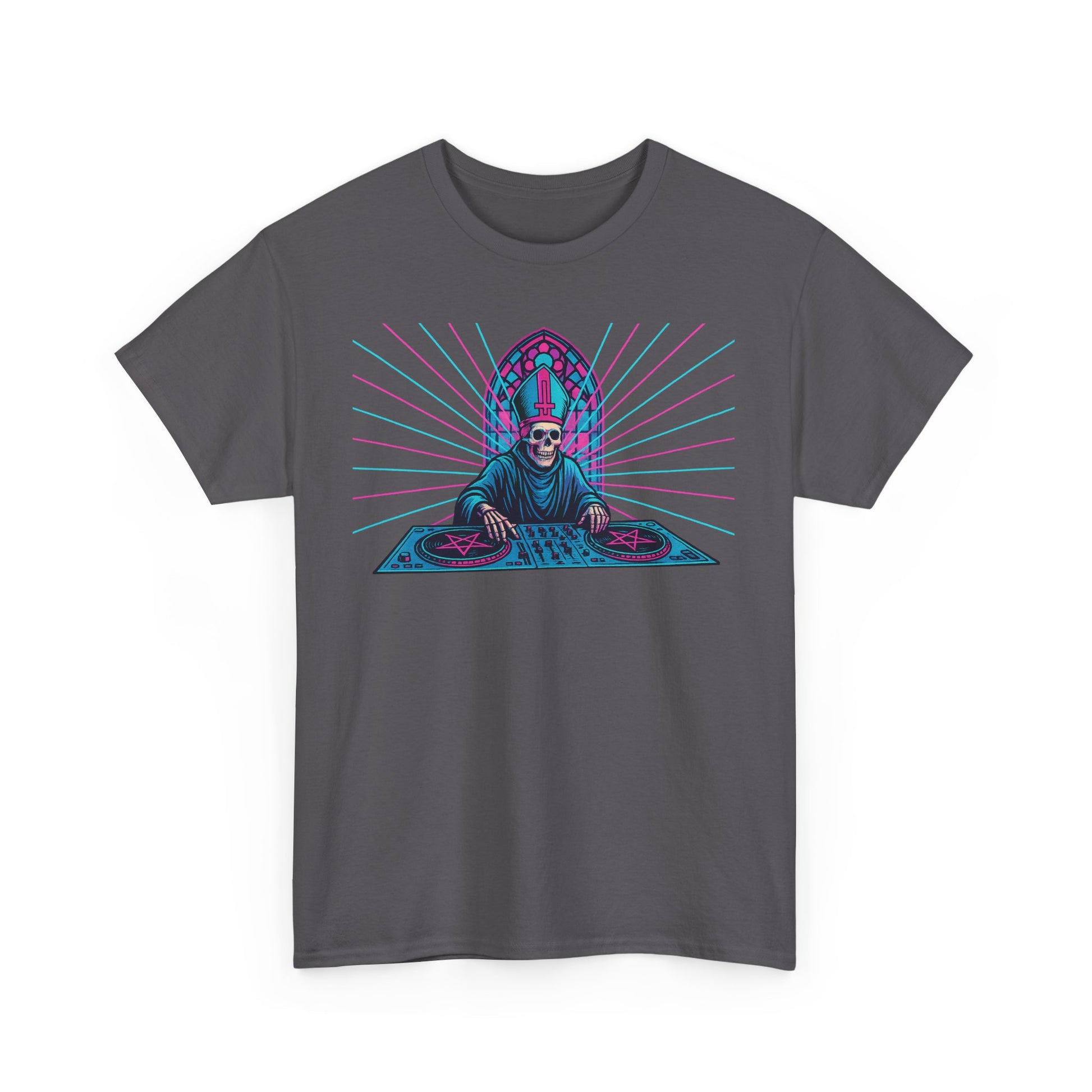 This t-shirt showcases a striking neon art design of a skeleton DJ wearing a bishop's hat, complete with an inverted cross. Positioned behind a pair of turntables adorned with pentagrams, the skeleton mixes tracks in front of a stained-glass window while vibrant Miami Vice–style lasers burst outward. The design blends gothic, electronic music, and retro color aesthetics, making it perfect for fans of dark, surreal, and bold streetwear.
