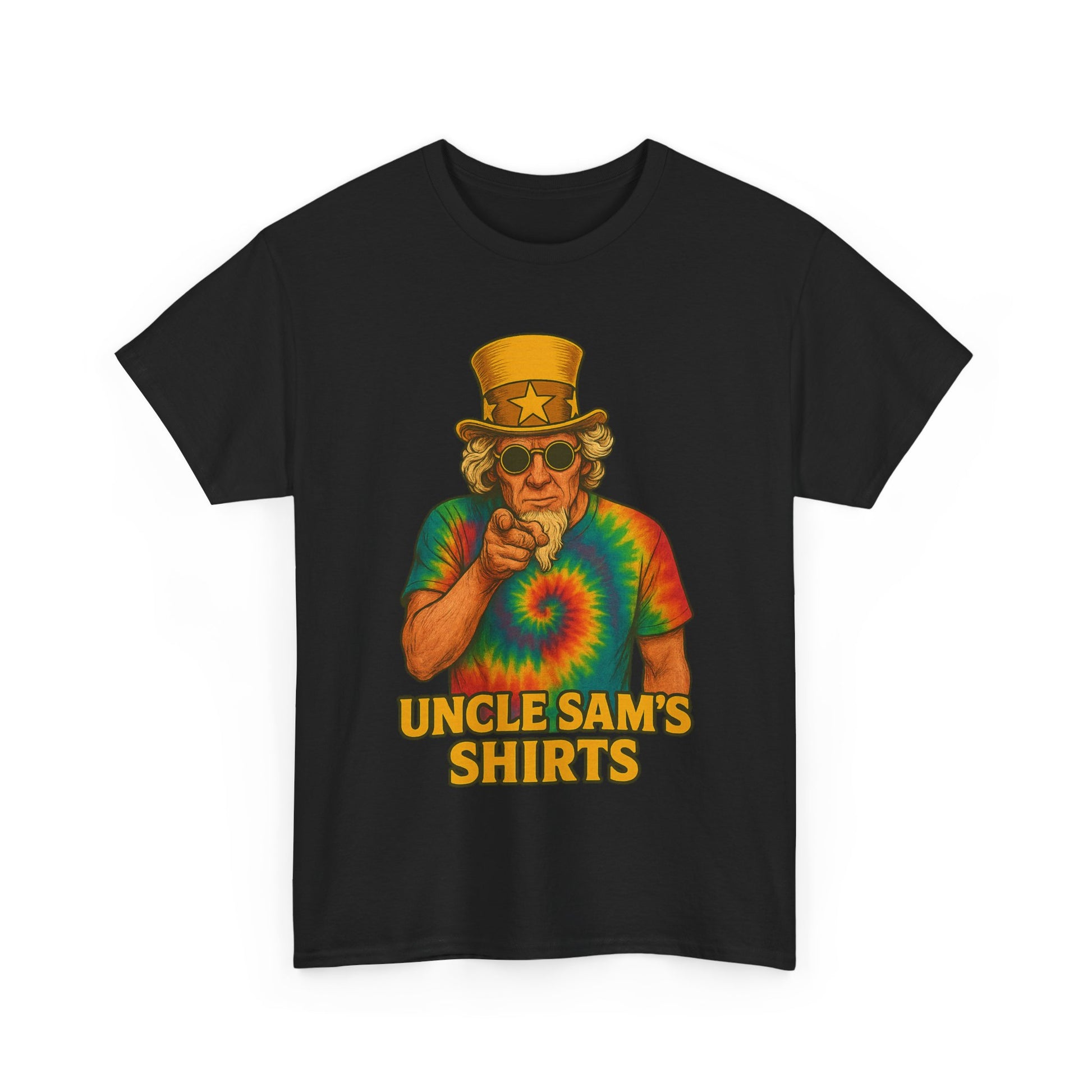 Keywords: Uncle Sam’s Shirts t-shirt, tie-dye Uncle Sam tee, groovy patriotic shirt, psychedelic USA shirt, brand logo shirt, funny Americana tee, red white and weird shirt, hippie Uncle Sam design, stoner patriotic shirt, cool logo graphic tee