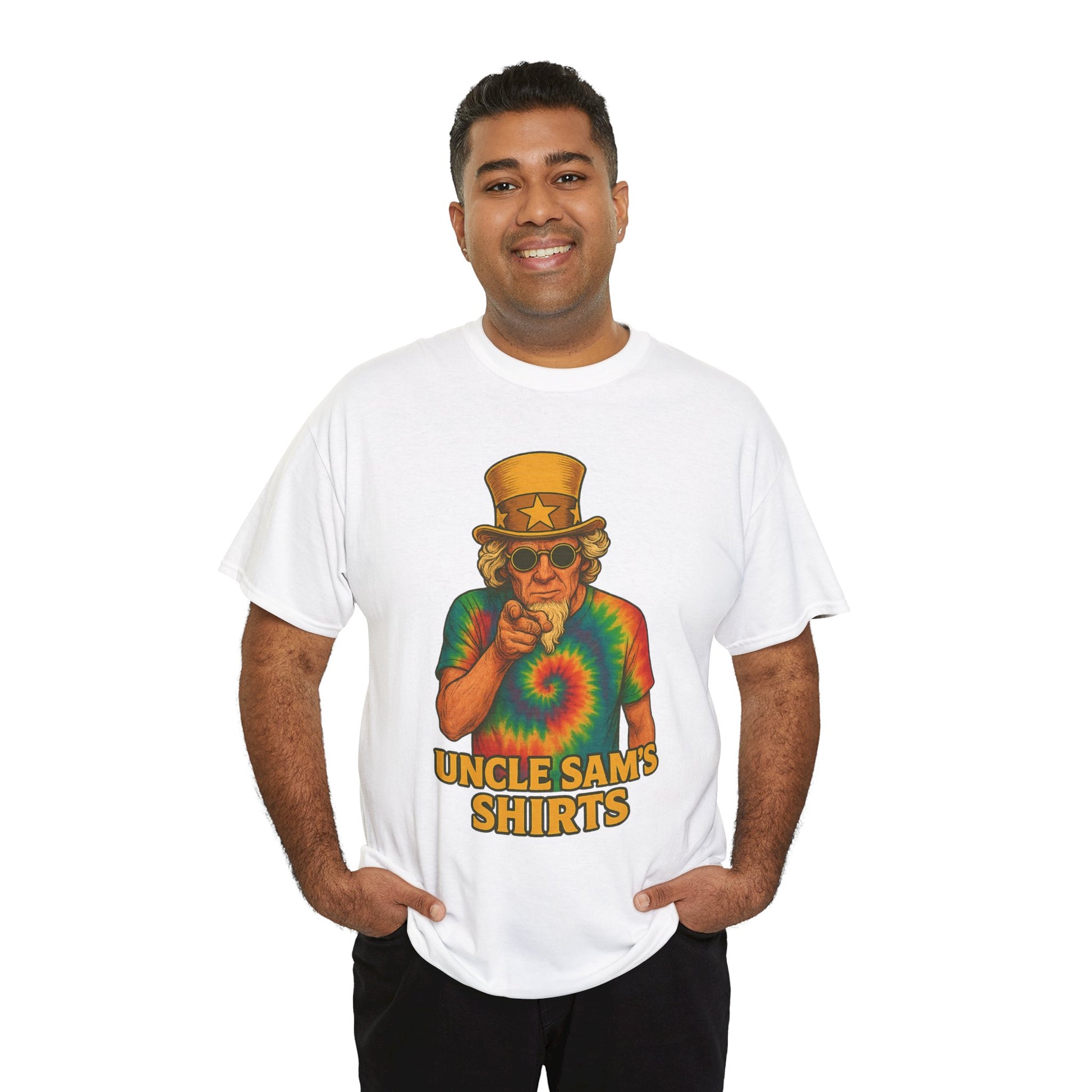 Uncle Sam’s Shirts Logo T-Shirt – Groovy Tie-Dye Patriotic Mascot Tee