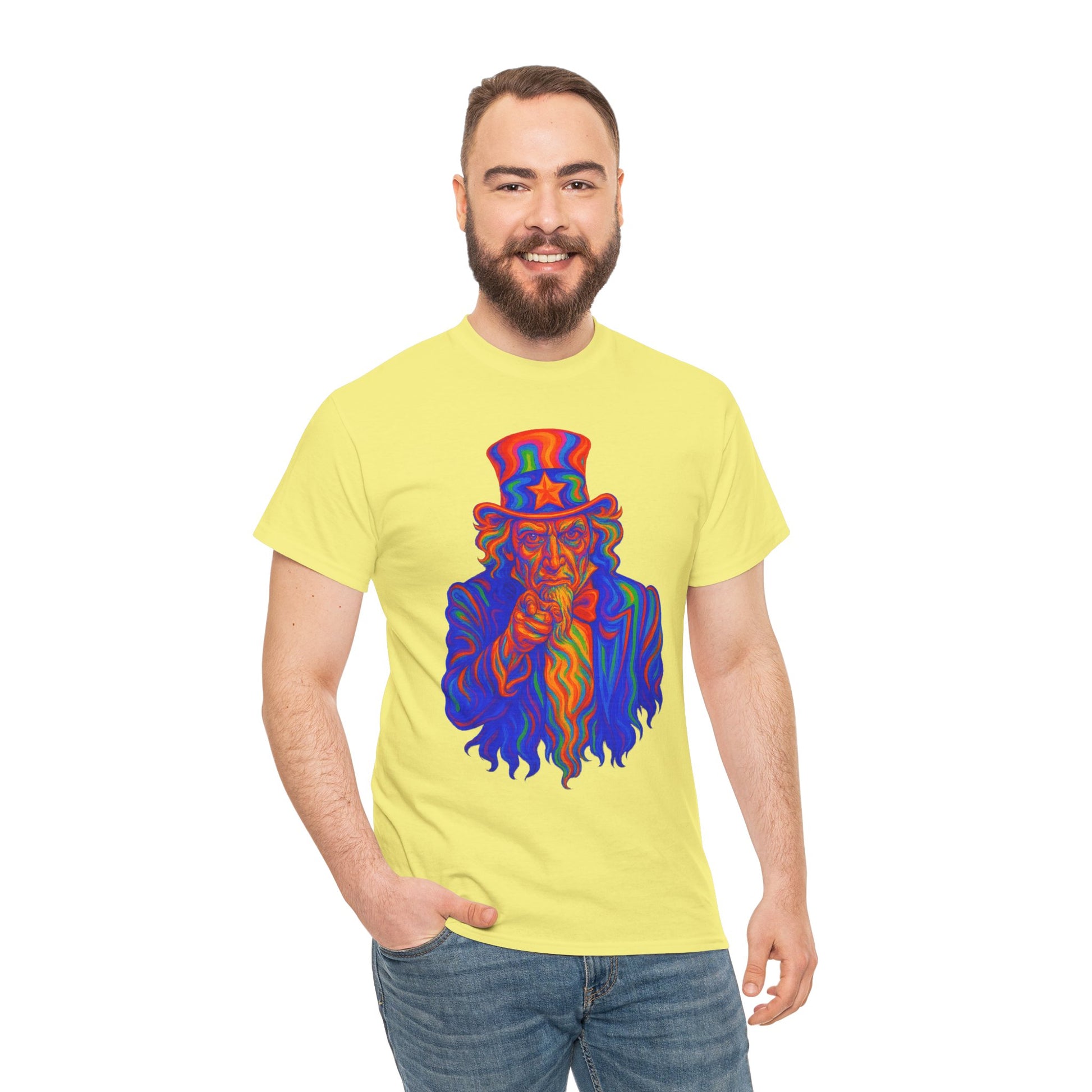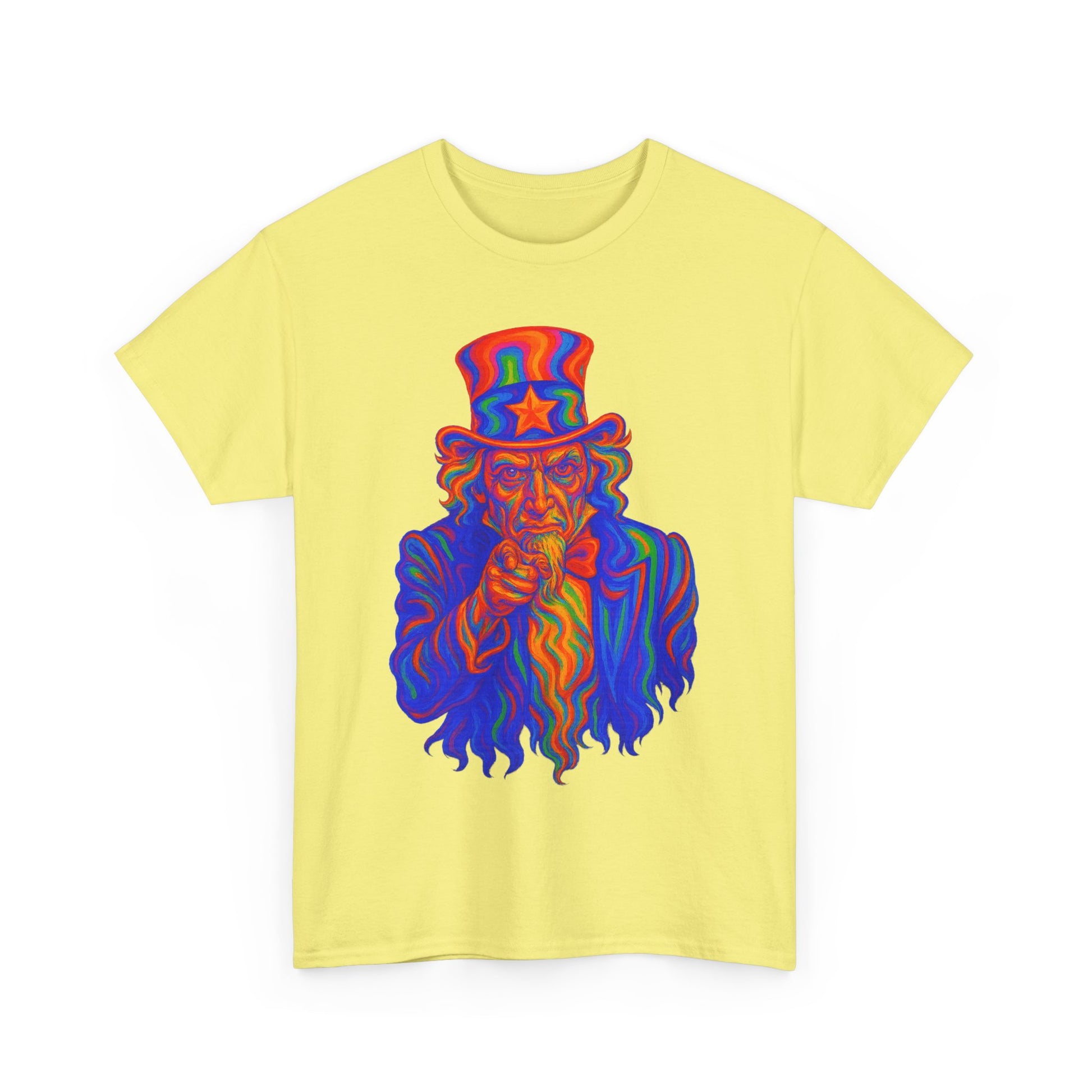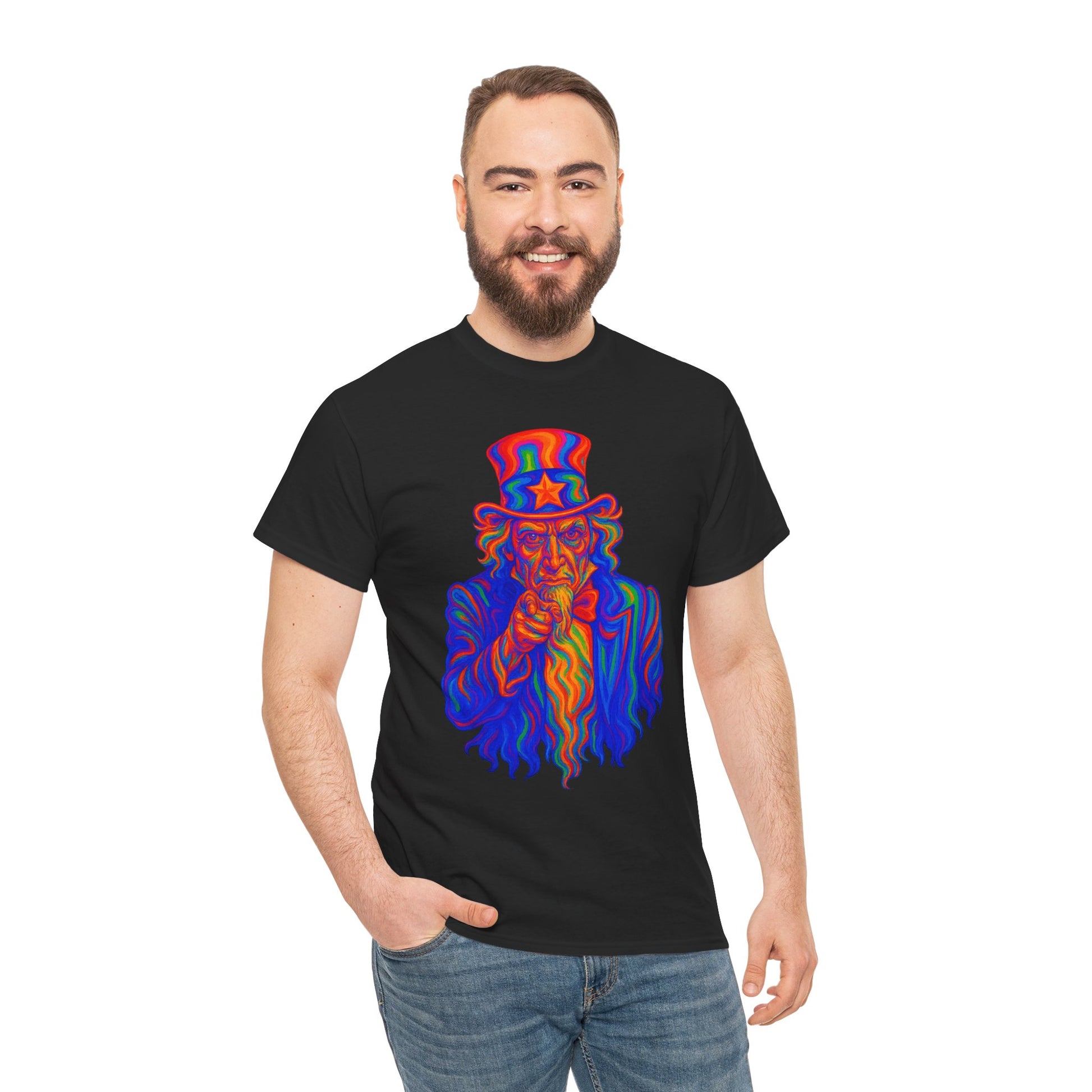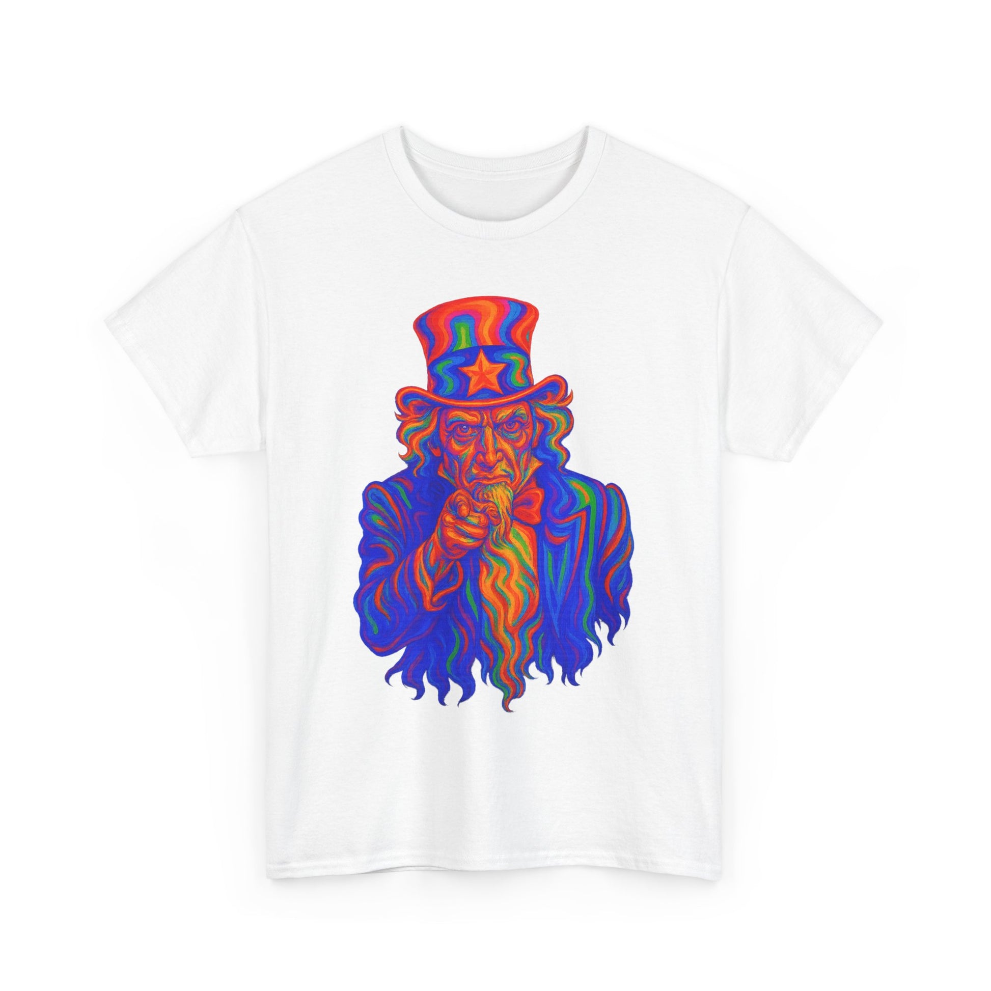 Uncle Sam’s gone cosmic. This warped, rainbow-drenched take on the classic “I Want You” poster is like a patriotism acid trip. With melting red-white-and-blue vibes and hallucinogenic intensity, this shirt screams freedom... just not the sober kind.